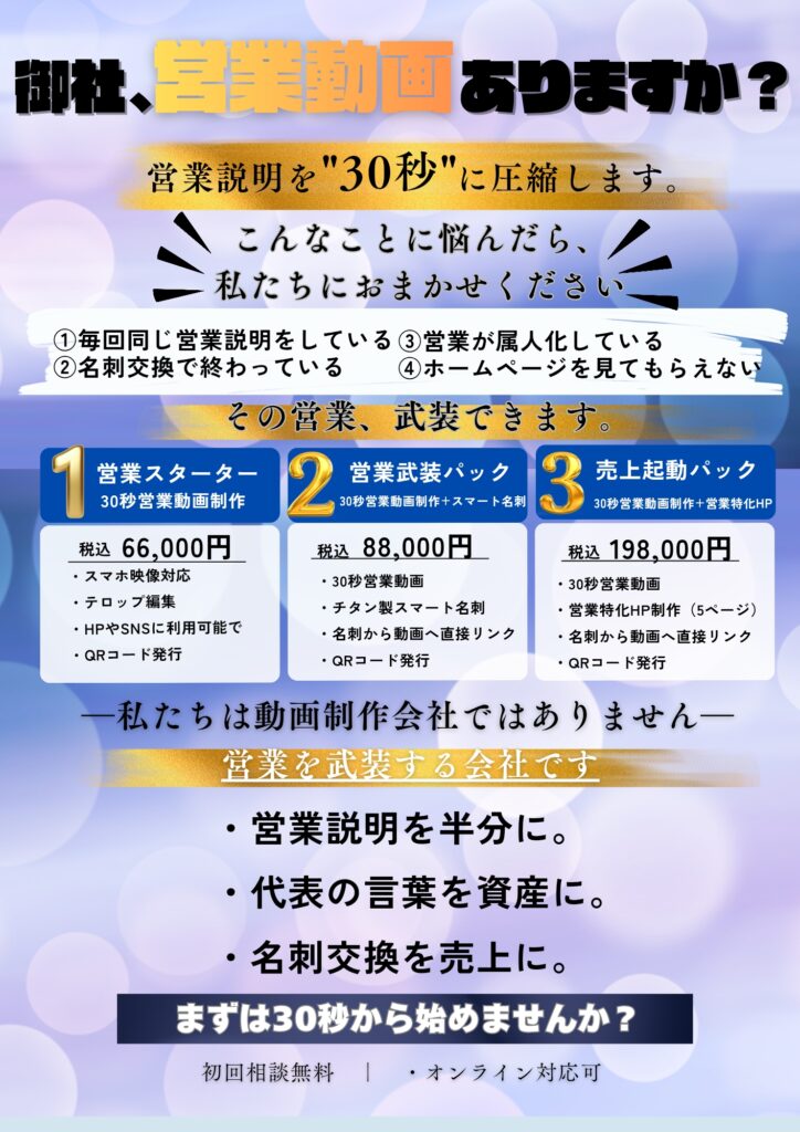 これを30秒で明確に伝える営業特化動画です。営業動画があることで、
